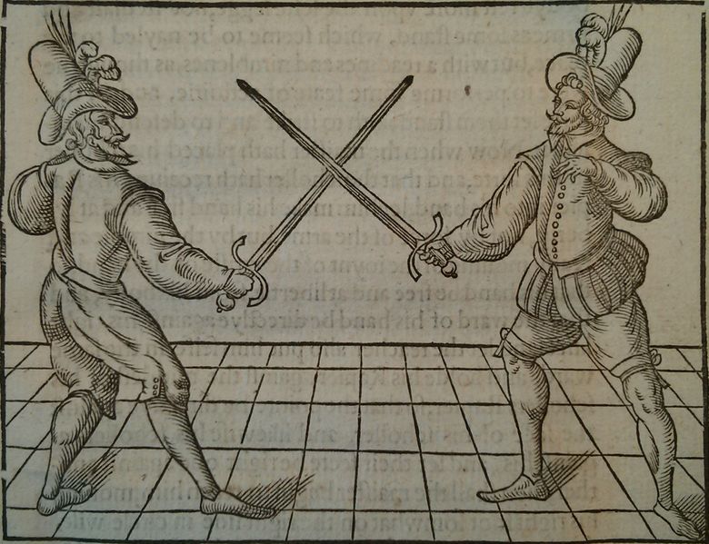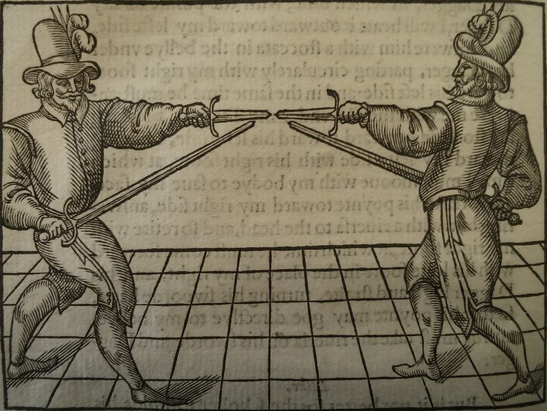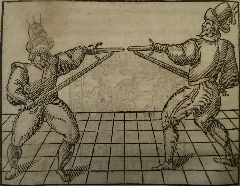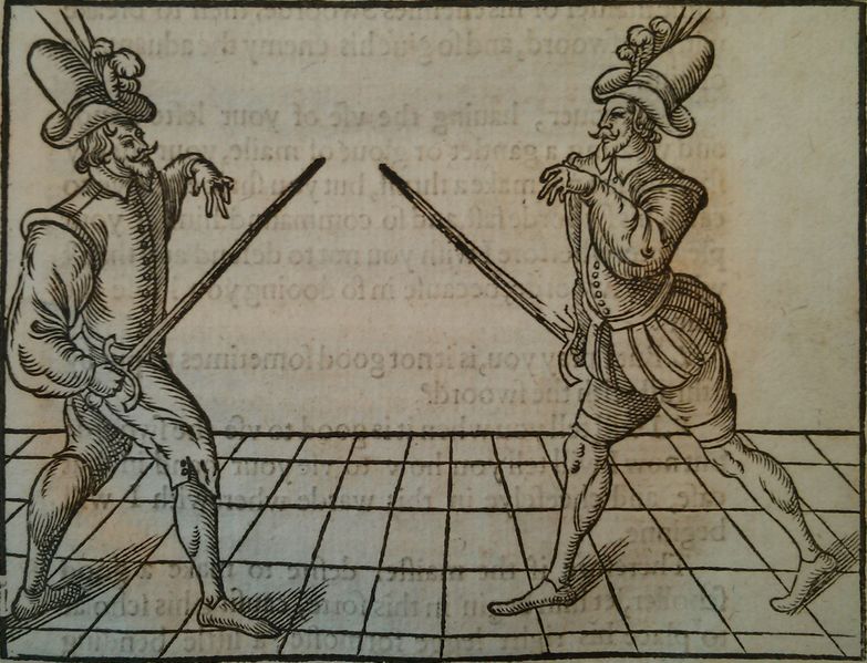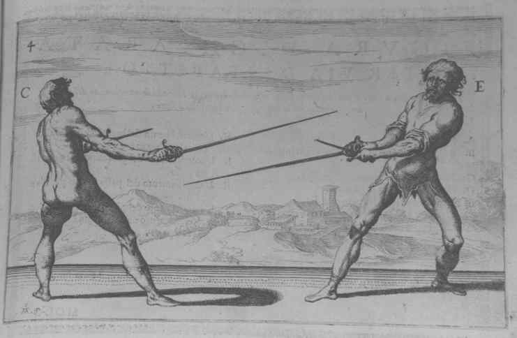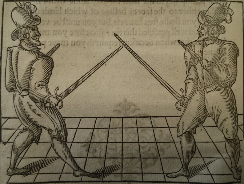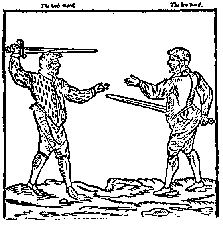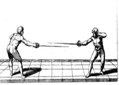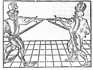 "V...he shal cause him to stand upon this ward, which is very good to bee taught for framing the foote, the hand, and the body: so the teacher shall deliver the Rapier into his hand, and shall cause him to stand with his right foote formost, with his knee somewhat bowing, but that his body rest more upon the lefte legge, not stedfast and firme as some stand, which seeme to be nayled to the place, but with a readines and nimblenes..."