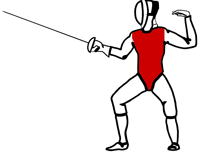 | Terza (Third): Sword held in a "hand shake" like position. Elbow near the lower rib cage, thumb on the upside. Elbow is bent, wrist cocked somewhat, point, menacing | |