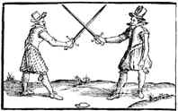 If you have a mirror, look at your profile when holding the sword with your wrist cocked, and then line the blade up with the forearm, tucking the pommel into the hollow of the wrist, and then observe your profile. You might see that a good back of the hand, wrist target area has just disappeared and the harder to hit elbow or upper arm is the closest thing to the opponent. Notice how there is a straight line from the tip all the way through to the elbow. Notice the differences with the above historical plates. A loose wrist leads to more cutting options. In historical play, the quick cuts are the defense action. It also means that you could be more exposed on the hand!!! If you do decide to lock the arm up, it becomes an entirely different kind of fighting style, more like modern fencing. The majority of movements there are made with the elbow only. While this may be more protective, and definitely is in keeping with more modern concepts, the rapier is a different weapon and has a great deal of more weight to it than a foil. Long term use of this type of presentation can lead to chronic elbow damage, and I don't feel this is appropriate for a rapier | ||
