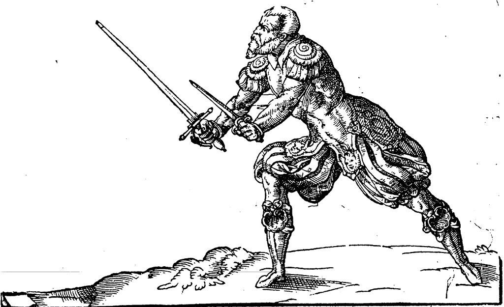 Second Ward: Sword held in broad ward, left foot forward, dagger active