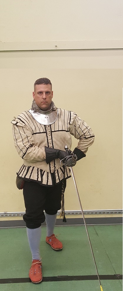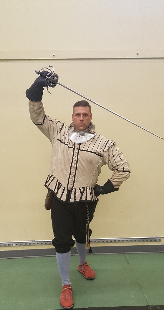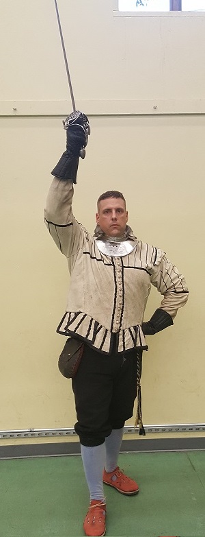 Instead of an attack in Secunda, we will use a terza thrust to the upper body, in order to give more space to show this correctly. The fencer will be putting the sword off to their left, and it will be readily apparent how this sets up for an offhand control, which will maintain the contact (thus stopping any ability to do something with the sword).