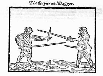 England was a country that was very traditional in its view of sword work. Sources on English sword work show that the English style was striving for its continued relevancy in the face of growing Italian influences in fencing, during the last half of the 16th century (Silver). Even though a continued interest in the rapier by the upper classes persisted, it is pretty much taken for granted that the middle and lower classes did not hold the rapier in much esteem. Indeed, it even seems to be an object of ridicule among traditional Masters of Fence in England (again, Silver). In England at the time, nearly every person from the lowest born to the highest carried a sword of some sort. This was primarily for the very practical reason of self-defense, since England was very violent, and quite dangerous to anyone walking about. The types of swords varied, but the fashion of a rapier persisted for the upper class, used as a means to settle questions of honor as well as practical self-defense. What sort of self-defending a rich, noble might have to do on their own behalf might be questioned, but if Silvers critique is to be believed, the habit of carrying a rapier had started to filter down to the class of not quite noble, not quite peasant.